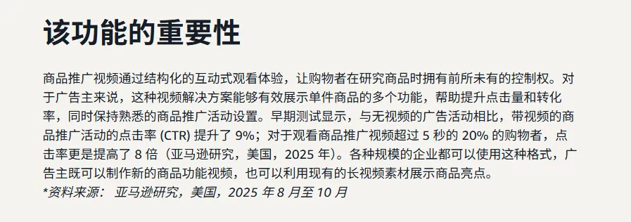 目前 SPV 广告优先对美国站卖家开放,且无需额外申请,登录广告后台即可查看。从内测反馈来看,无论中小卖家还是大卖,只要账户状态正常、产品有合规视频素材,均可参与投放,暂时无店铺层级限制。