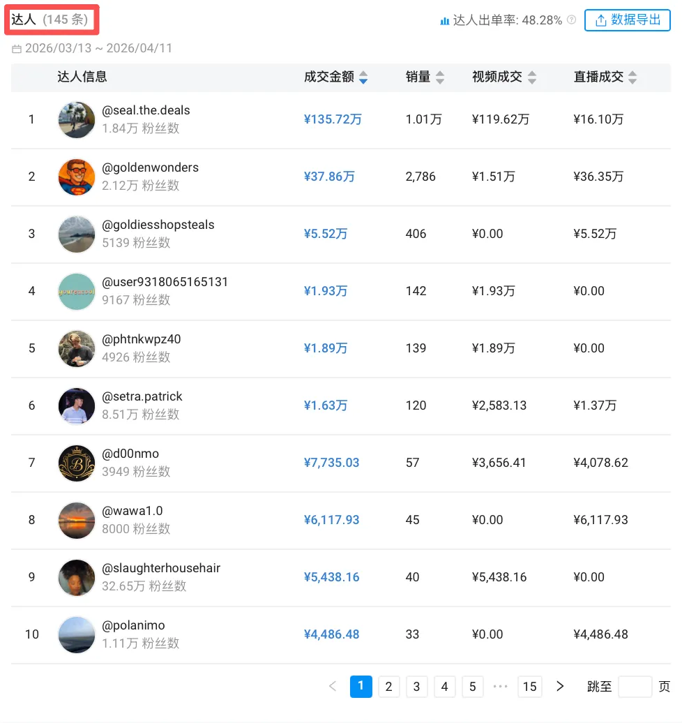综合来看这款短裤流量运营的成功经验,首先就是其凭借11%的佣金撬动145位垂类达人搭建推广矩阵,形成头部破圈、中尾部铺量的内容供给;然后采用 “自然测款+付费放大” 的投流策略,形成短视频为主、直播为辅的转化闭环。总结下来就是该爆款以达人矩阵为内容核心,精准投流为流量抓手,短视频+直播双渠道协同,筑牢了百万级GMV的成交基本盘。