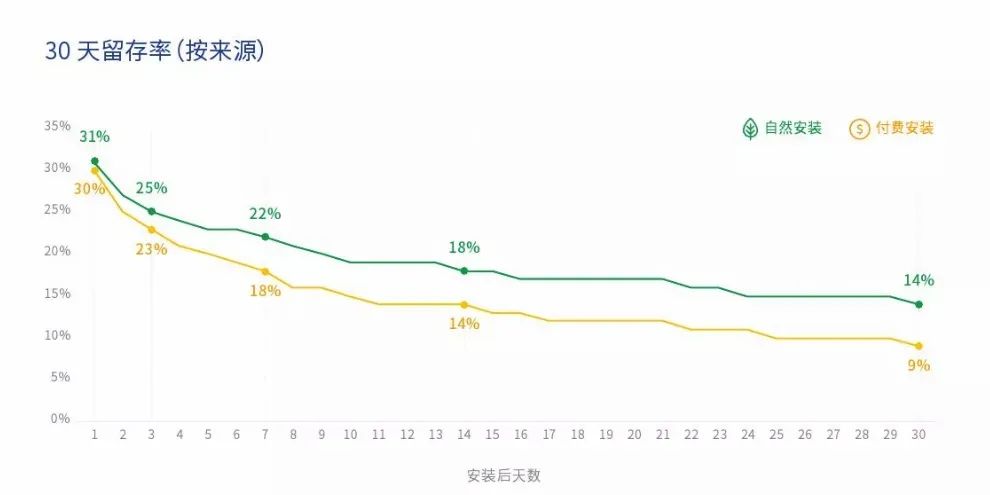 在自然安装和付费安装的对比中还可以发现,在日本自然安装用户相比于付费买来的用户更加忠诚,而且时间越久这种忠诚度差距越大。