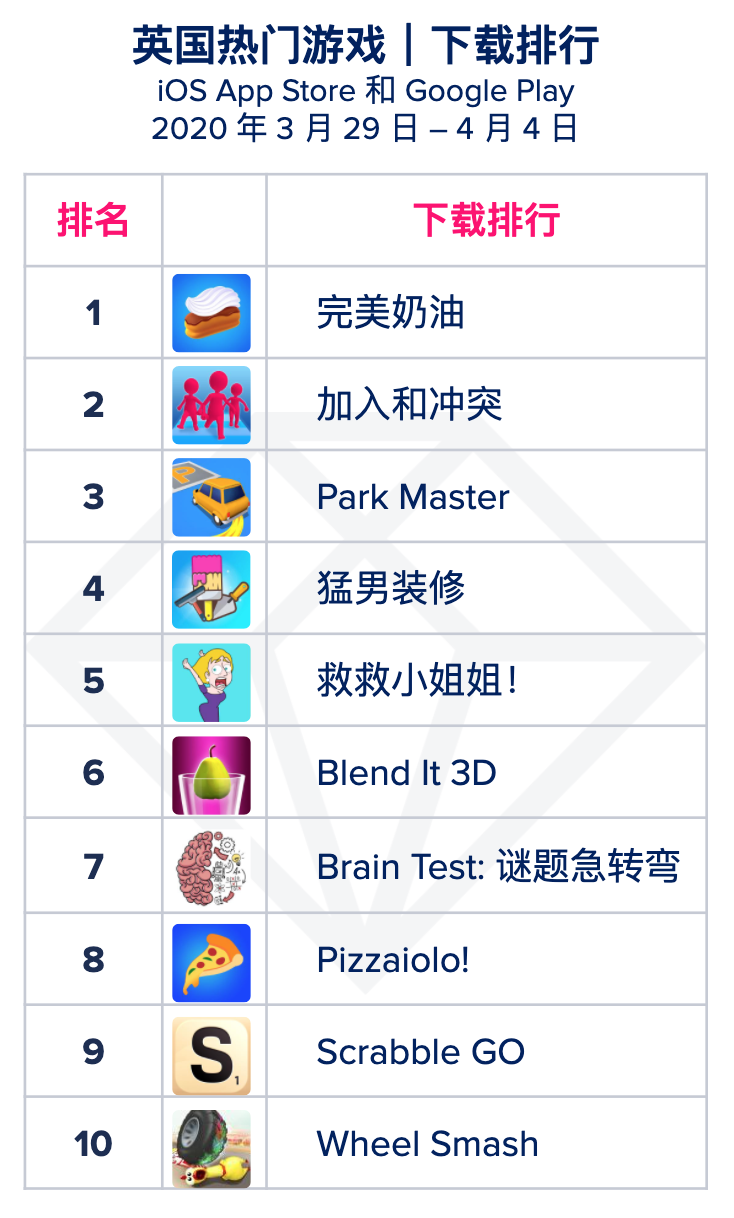 英国的隔离政策已进入了第4周(3月29日-4月4日)。本周,我们来洞察英国移动游戏走势。英国下载榜中,同样可以看到非常明显的超休闲“霸榜”趋势。