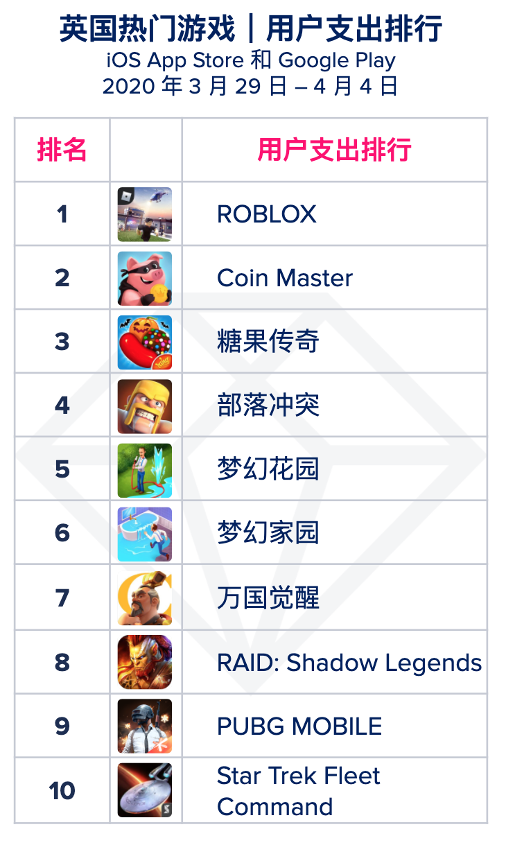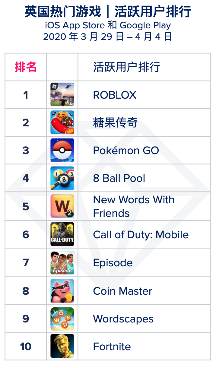 《ROBLOX》在英美 WAU 榜中均独占鳌头,《糖果传奇》和《Pokémon GO》也纷纷占据前 3 名的剩余位置。