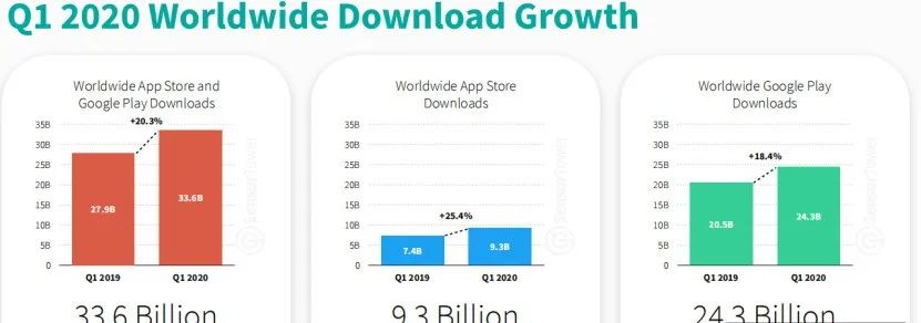 4 月 16 日 Sensor Tower 发布了2020年第一季度的移动应用报告,2020 年 Q1 全球 App 新增下载量达到 336 亿,较去年同期同比增长 20.3%,值得注意的一点是,这一季度,iOS App Store 的下载增长比例为 25.4%,高于 Google Play 的 18.4%。