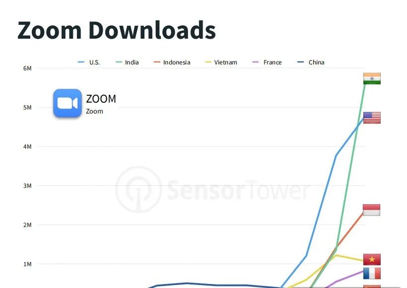 另外,Zoom 的下载排名因疫情原因而迅速蹿升至第 7 位首次进入20 强榜单,新增下载 8000 万次是 2019 年 Q4 的 11 倍以上,新增用户主要来自印度、美国、印尼、越南、法国和中国。