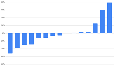 Insideretail 采访了 15 家澳大利亚在线卖家,包括时尚、美容、运动器材、婴儿、玩具等各种行业和规模。最小的年营业额超过 500 万美元,最大的远远超过 1 亿美元。所有数据都是匿名提供的。调查基于从 3 月 10 日到 3 月 16 日这一周的收入变化与一个月前 2 月 11 日到 2 月 17 日的收入变化的对比。结果如下: