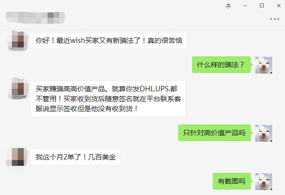 最近,根据卖家爆料,他在wish平台出现多起买家针对高价值产品恶意退款的英国和加拿大订单,几个恶意退款,都是一单买了几个,然后说收到的货物损坏,尺寸不对等。传了一个产品的图片就被客服退款了。还有买家收到货物签收以后却联系平台说订单显示签收但没有收到货物,仅仅两个月,这位卖家就已经损失了上百美元。