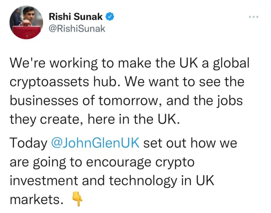 对于这一最新计划,英国财政大臣苏纳克(Rishi Sunak)说:我的雄心是让英国成为加密资产技术的全球中心,我们今天概述的措施将有助于确保公司能够在这个国家投资、创新和扩大规模。