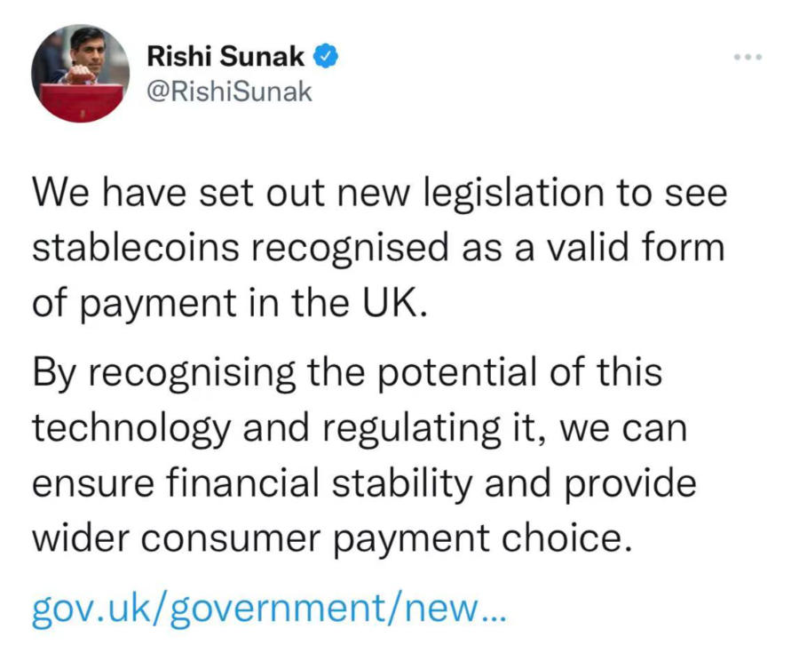 苏纳克还表示:政府希望在未来看到更多的加密货币企业在英国出现,创造就业机会。针对稳定币,还制定了新的立法,使稳定币在英国被认可为一种有效的支付方式。