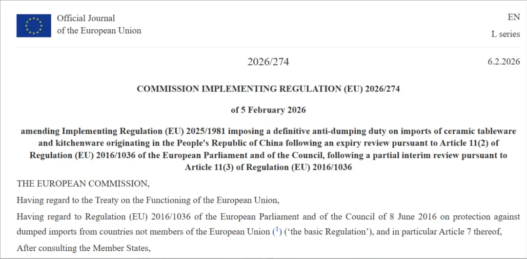 当地时间2026年2月5日,欧盟委员会发布官方公告,对原产于中国的陶瓷餐具和厨具(Ceramic Tableware and Kitchenware)作出反倾销期中复审终裁,正式实施“单一国家税率”(country-wide duty),决定对所有中国生产商及出口商统一征收79.0%的反倾销税,这一举措全面取代了此前针对不同企业设定的13.1%至36.1%的个别税率区间,力度大幅加码。