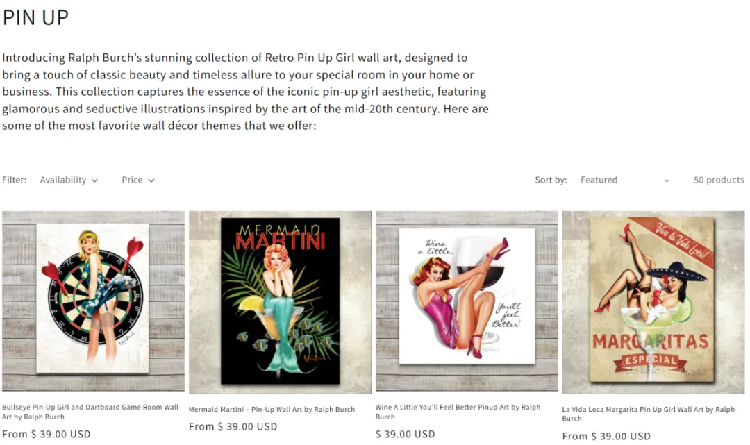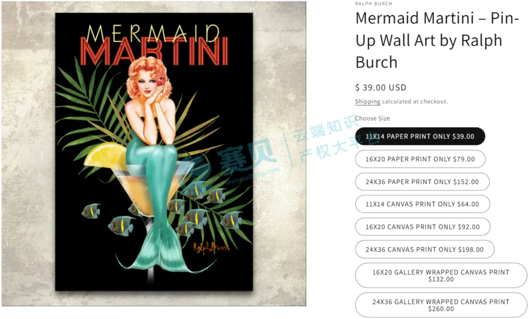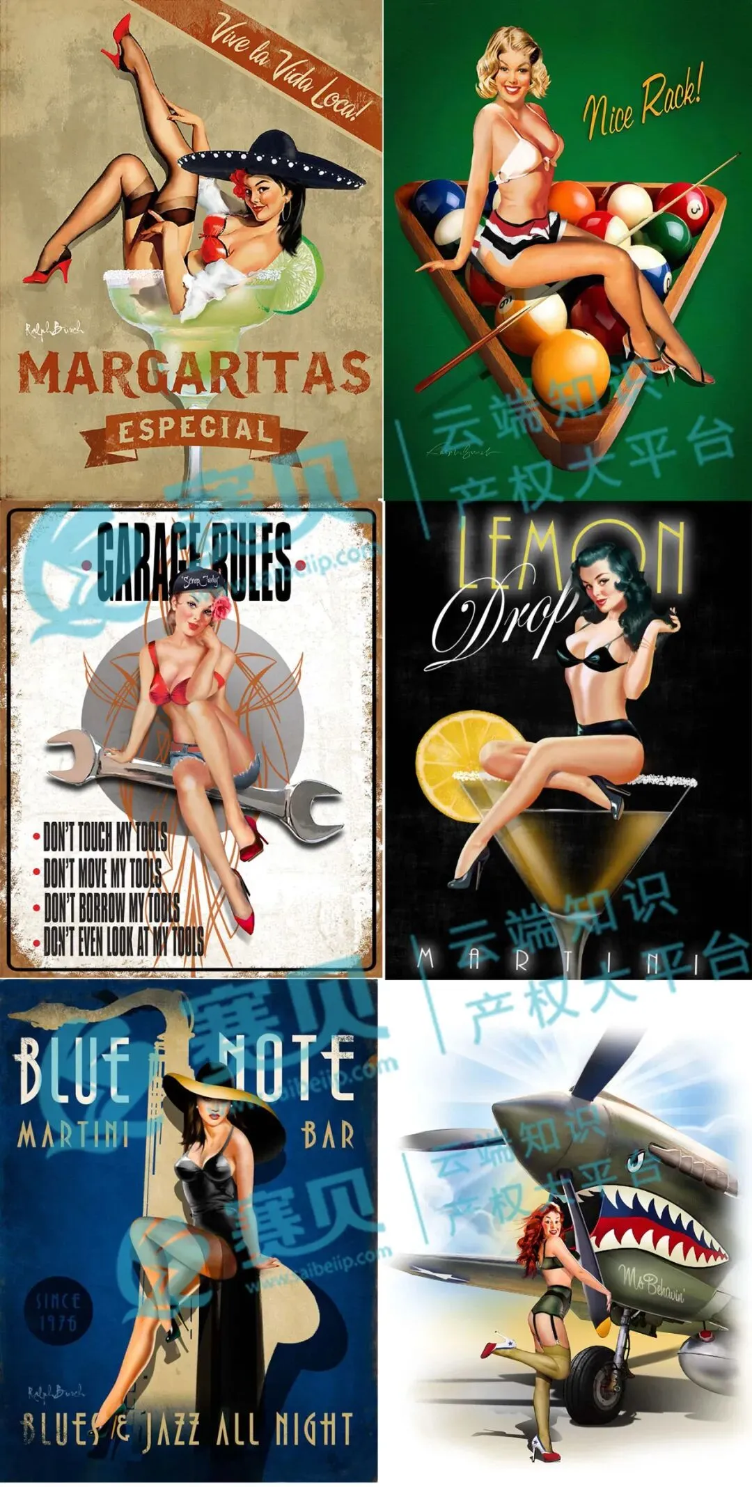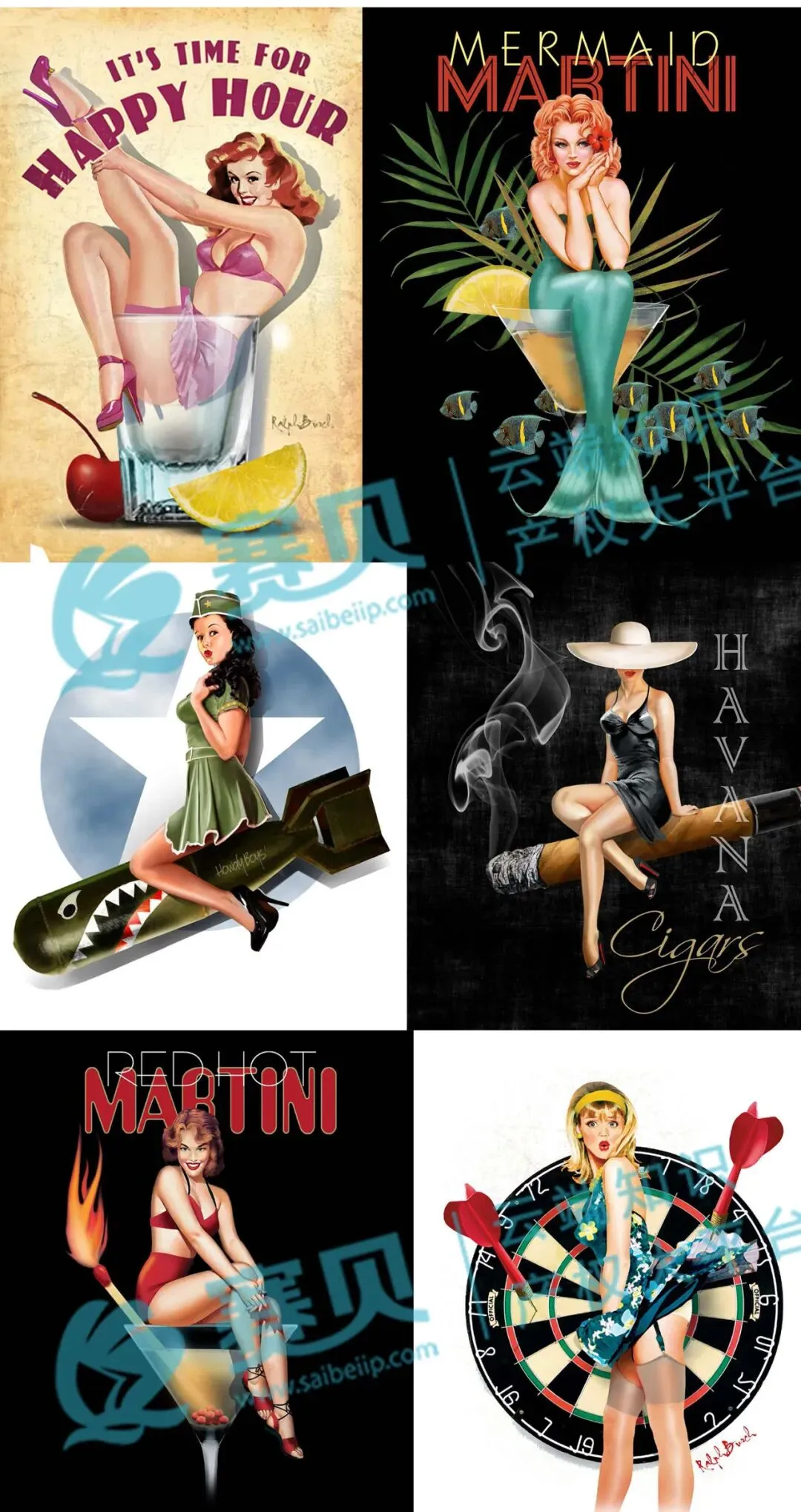 此次维权的核心是Ralph Burch创作的12项 复古Pin-up风格原创美术作品,涵盖酒水主题、复古场景等。以性感女性形象为核心,结合酒水、工具、娱乐等生活化元素,适配装饰画、海报等跨境电商热门品类。赛贝提醒面中的文字、道具等元素均为版权保护的一部分,哪怕只截取局部图案印在产品上,也易构成侵权。