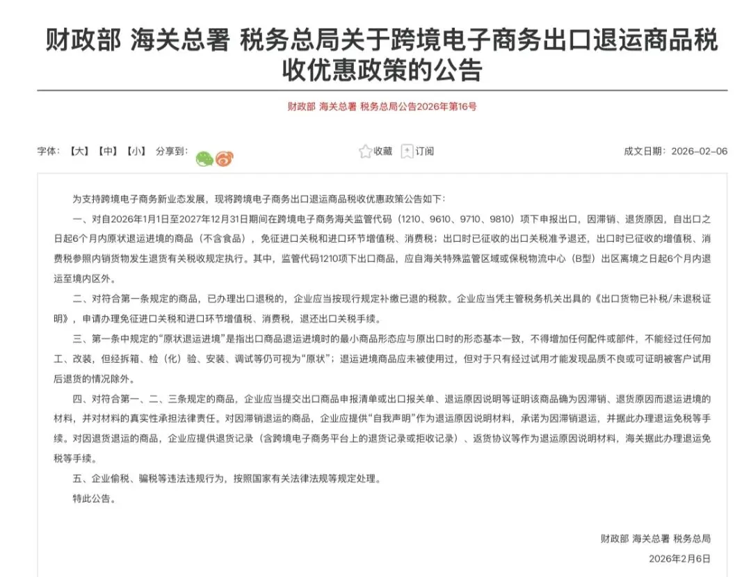 财政部、海关总署和税务总局于2026年2月6日联合发布了一项重磅政策——《关于跨境电子商务出口退运商品税收优惠政策的公告》。
