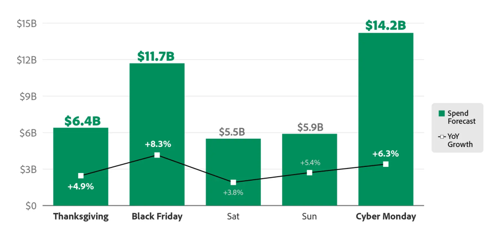 Adobe 预计在2025年11月至12月,美国线上假日销售将首次突破2543亿美元,同比增长约5.3%。在这其中,Cyber Week(含感恩节至网一)预计贡献约437亿美元,约占总额的17.2%。单日来看,Cyber Monday 仍将成为最强线上购物日,预计销售额达142亿美元。Black Friday 则有望同比增长8.3%,达到117亿美元。
