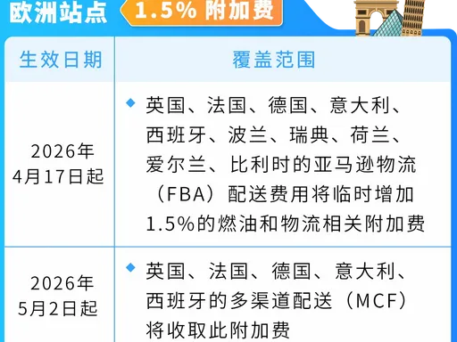 FBA配送费:自2026年4月17日起,加收1.5%的临时附加费。
