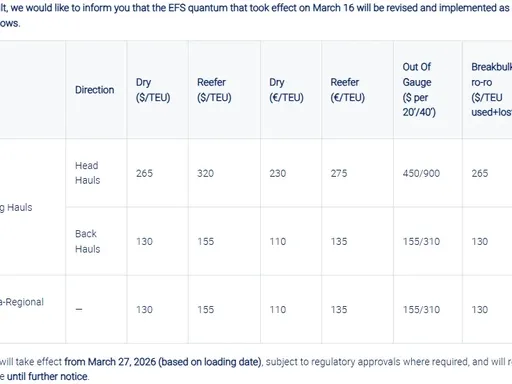 赫伯罗特(Hapag-Lloyd):3月23日起对长航线征收EFS,干箱160美元/TEU,4月8日扩展至美国航线; 达飞(CMA CGM):3月27日起,全球主航线干箱加收265美元/TEU,冷藏箱加收320美元/TEU。 马士基(Maersk):3月25日起,全球长航线加收200-400美元/柜不等的附加费。同时调整南美、南非等航线旺季附加费(PSS),每箱加收250-1000美元。 MSC(地中海航运):亚洲至美加航线,附加费高达136-644美元/柜。