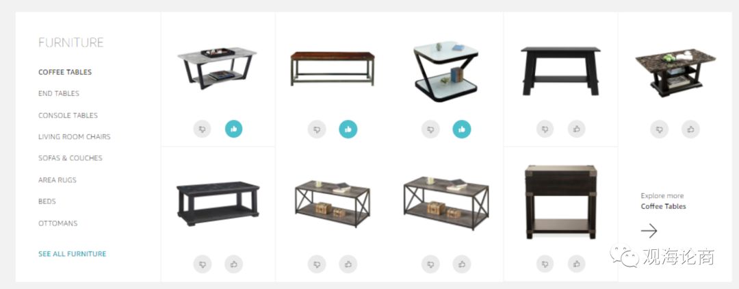 网站采用了Pinterest的风格搭配,直接通过视觉图片快速完成选择,最简单的“喜欢”或者“不喜欢”,准确给消费者最简单的选择匹配。同时亚马逊也可借此大量收集用户的习惯和偏好数据,这些数据将同步应用于Alex和Echo中用于消费者的再次推荐购买。