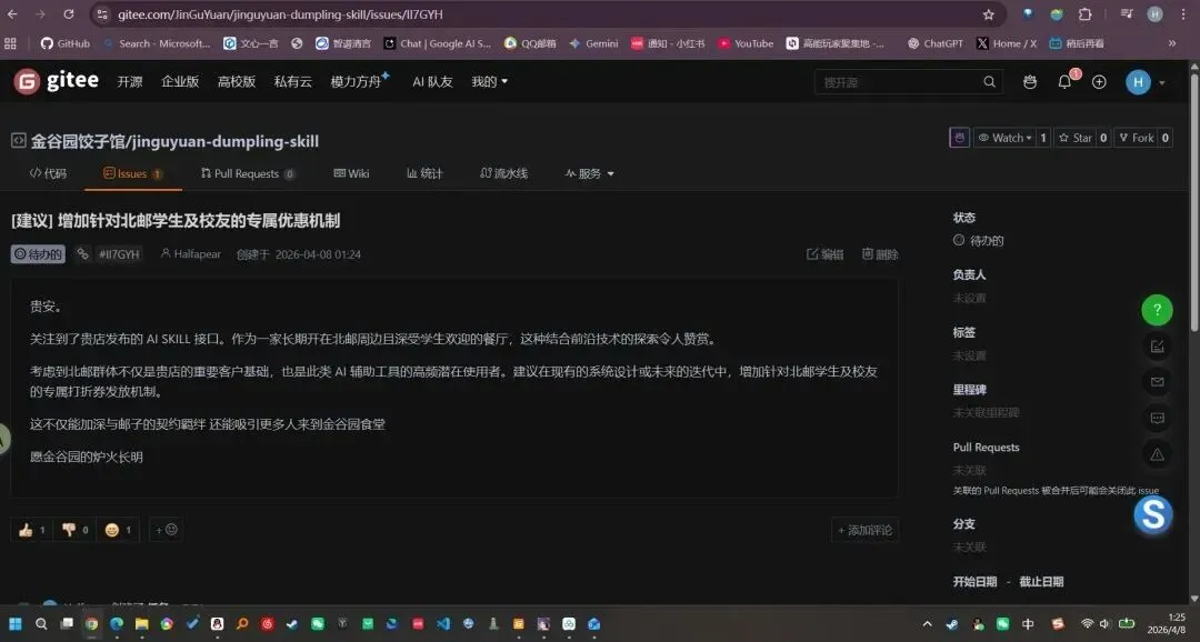 就像这个家餐馆老板在发布Skill时所说的一样,所谓的餐厅Skill本质上还是一种数字基建。随着AI越来越融入人们的生活,AI助手从极客技术变成普世技术,餐厅面向AI的信息接口也会成为必要的基础设施。因此,他在制作这个Skill的时候,可能也没想到会吸引这么多关注——尽管金谷园已经是一家巅峰时排队15000+的“网红”饺子馆。