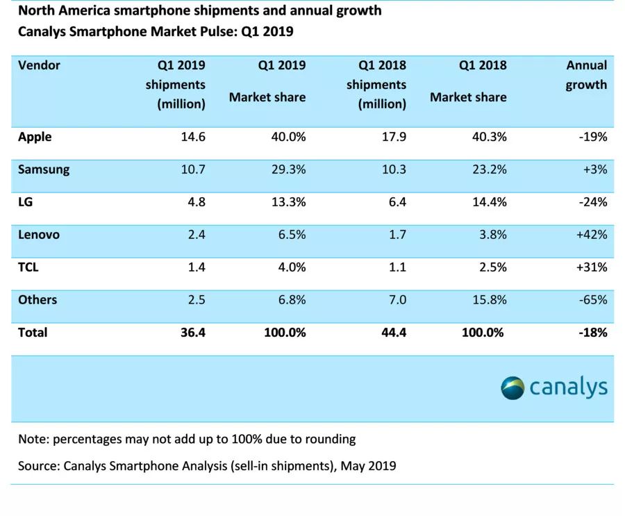 据 Canalys 最新数据显示,2019年第一季度北美智能手机出货量从4440万下降至3640万,同比下降 19%。苹果仍然排名榜首,在北美市场的份额为 40%。LG、联想和 TCL 进入前五名,后两家公司在市场份额方面取得了明显进展。