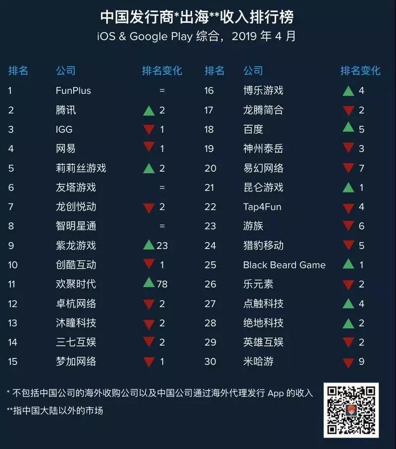 App Annie:网易、腾讯进入4月中国出海发行商收入排行榜单 Top 5。36氪悉,App Annie 发布2019年4月中国出海发行商收入排行榜单,Top 10依次为:FunPlus、腾讯、IGG、网易、莉莉丝游戏、友塔游戏、龙创悦动、智明星通、紫龙游戏和创酷互动。此外,欢聚时代、三七互娱、百度、游族和猎豹移动分别位列第11、14、18、23和24位。