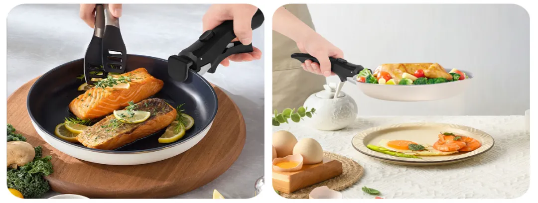 新型可拆卸锅柄通过优化设计采用简化锁定机构,且其所有组件均嵌入手柄内部。该设计不仅提升了组装的便利性、可靠性与使用安全性,还有效改善了产品视觉美感。