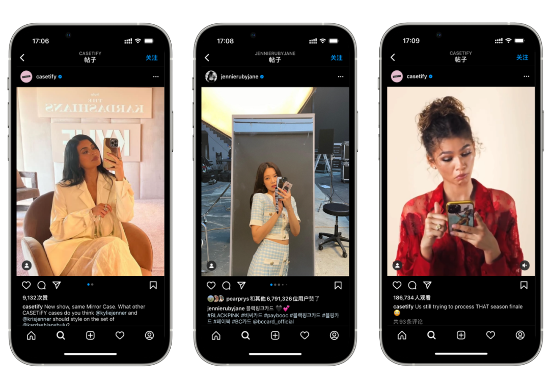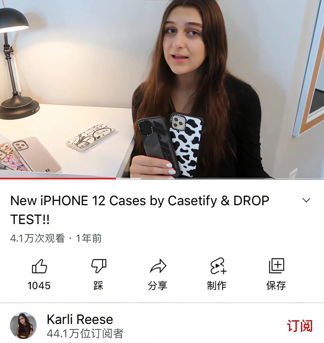 CASETiFY 的产品灵感和设计一直走在潮流时尚的前端,不断吸收市场资讯和流行趋势。定位主要目标客群千禧一代、Z 世代年轻人,他们是目前主要活跃于互联网和各大社交媒体平台最多的群体。CASETiFY 将一大营销重心投放在海外 KOL 营销上,从而增大产品的知名度和曝光量。TikTok 和 Instagram 是社媒营销主力,共计粉丝数已超过 300 万。此外,在 YouTube 上,CASETiFY 结合平台用户习性投放了众多 KOL 发布 CASETiFY 手机壳“防摔测试”视频,同时吸引硬核玩家的注意。