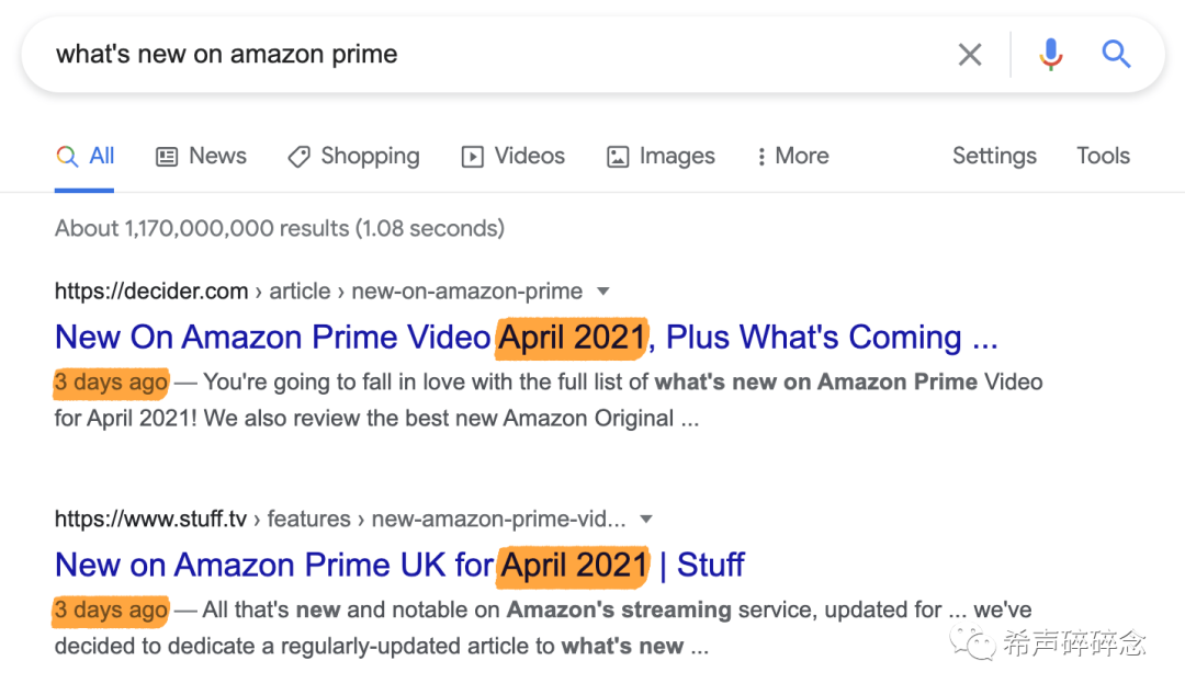 对于 “what’s new on amazon prime” 这样的搜索,新鲜度很重要。因为搜索者想了解最近添加的电影和电视节目。这可能就是 Google 给新发布或新更新的页面排名更高的原因。