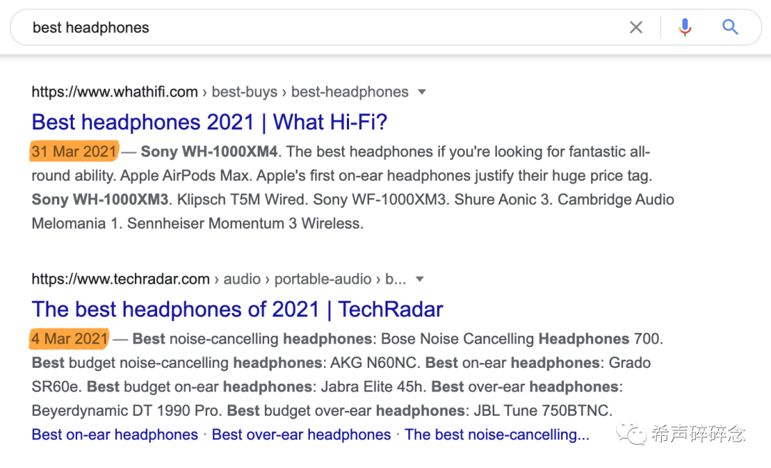 对于诸如 “best headphones” 之类的搜索,新鲜度也重要,但不是最重要的。因此 2015 年的页面可能不太适合,但是 2–3 个月前发布的帖子仍然有用。