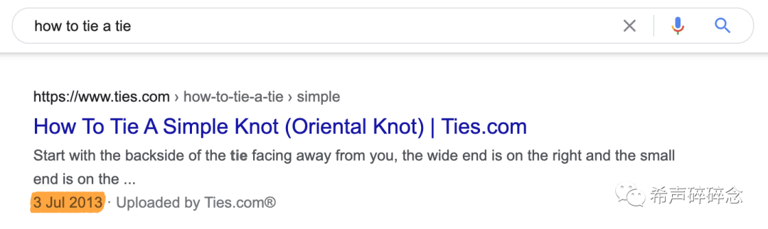 也有一些查询结果的新鲜度与无关,例如 “how to tie a tie”。因为方法没有任何变化,因此搜索结果是昨天还是 1998 年都无关紧要。Google 知道这一点,并且对多年前发布的文章进行排名没有任何问题。