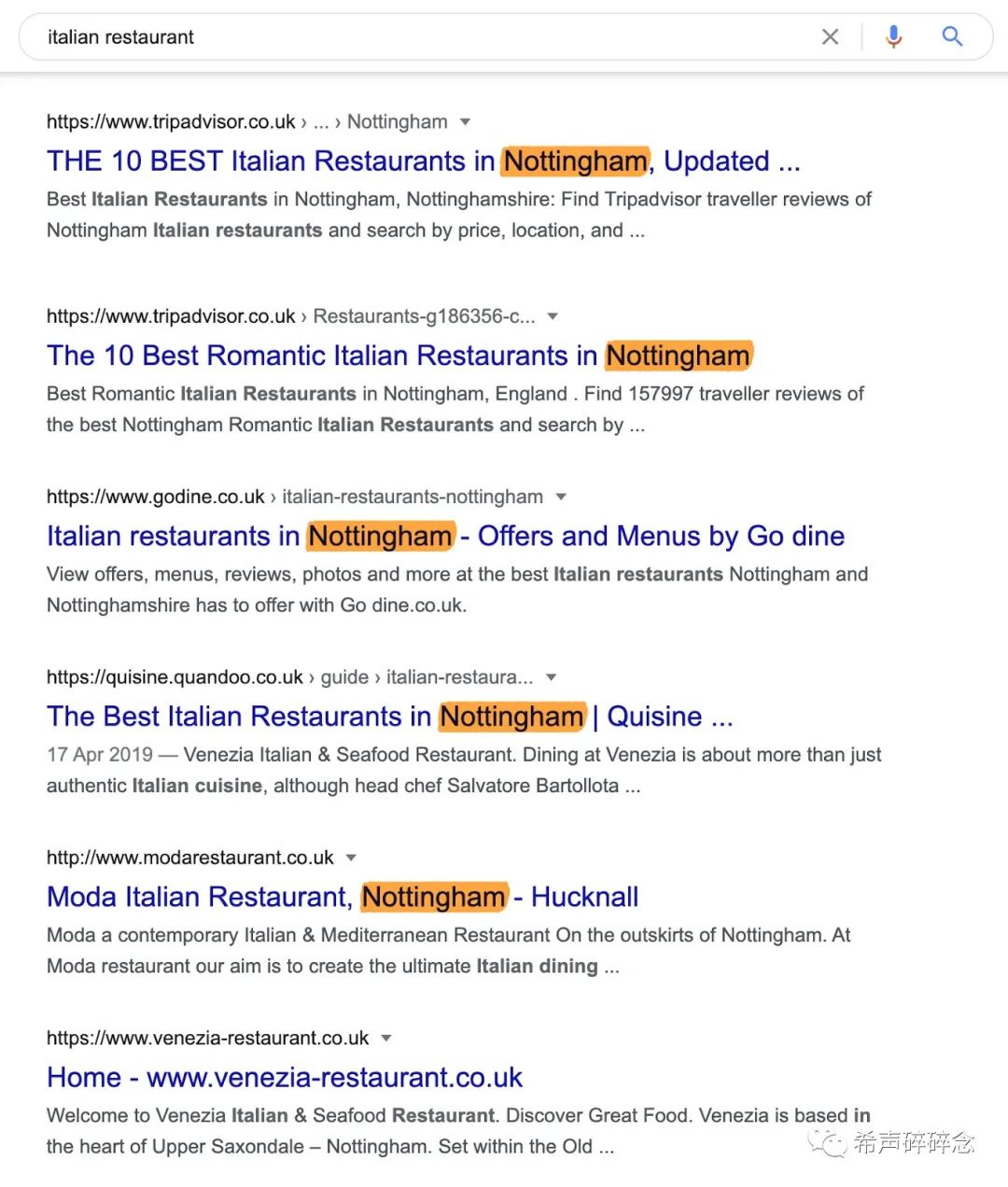Google 也会使用你的位置来个性化除地图之外的搜索结果。如果我们向下搜索 “italian restaurant”,甚至 TripAdvisor 的结果都是个性化的,并且我们看到许多排名高的搜索结果都是本地餐厅的网站。