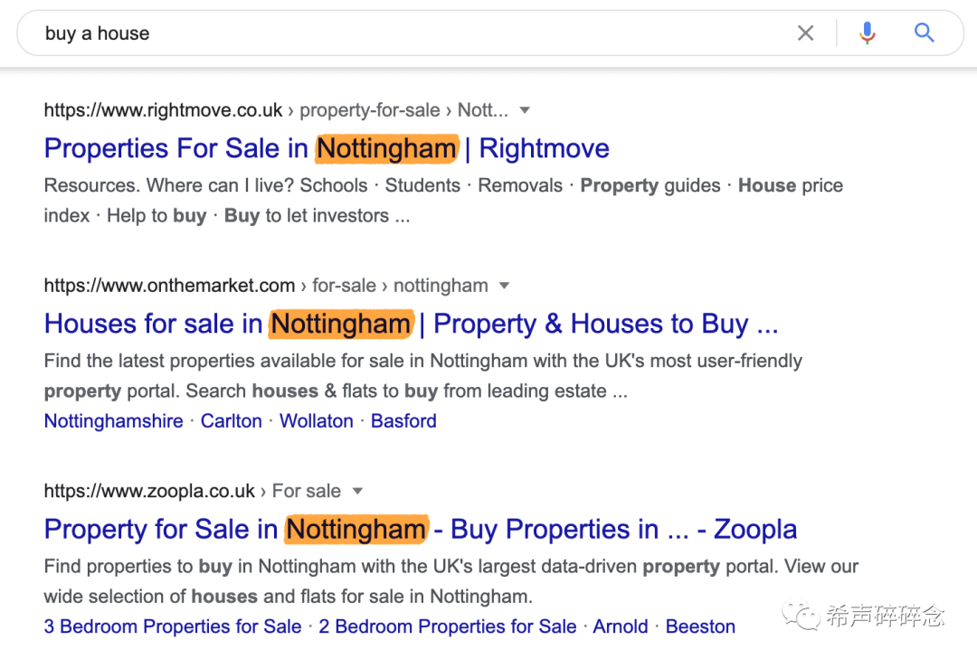 对于类似 “buy a hous” 这样的搜索,情况与此类似。Google 会返回本地的列表而不是其他国家的列表页面,因为你太可能迁移到其他国家/地区。