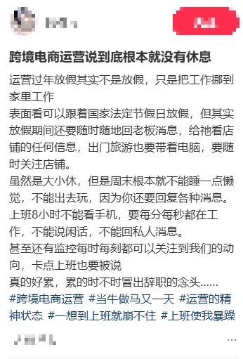 不过与此同时,还有另一些运营表示,由于店铺商品还在售,因此即使进入春节假期,自己也被要求每天关注店铺情况,甚至还要发货和调广告,根本无法得到完整休息,也很影响外出计划: