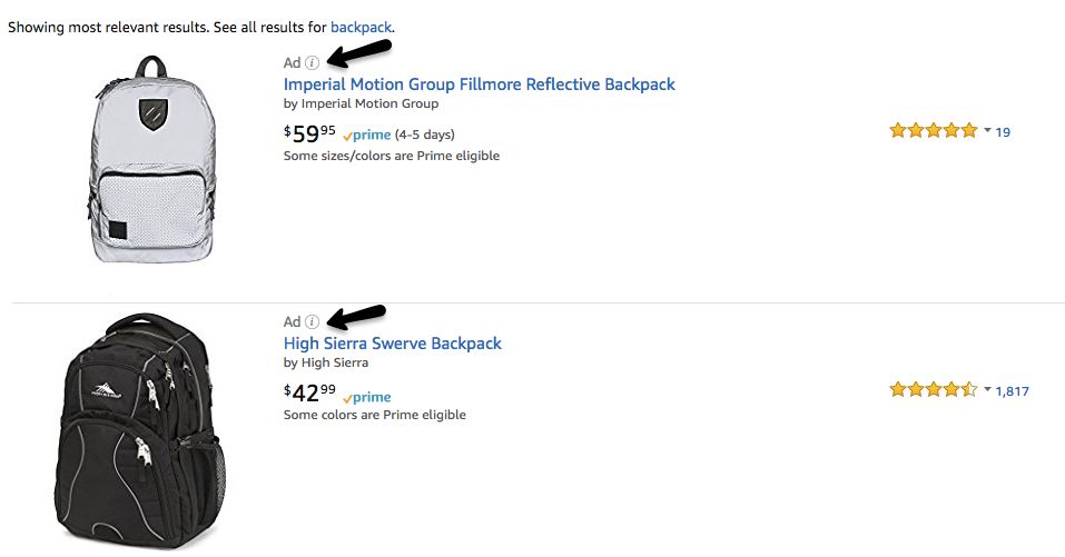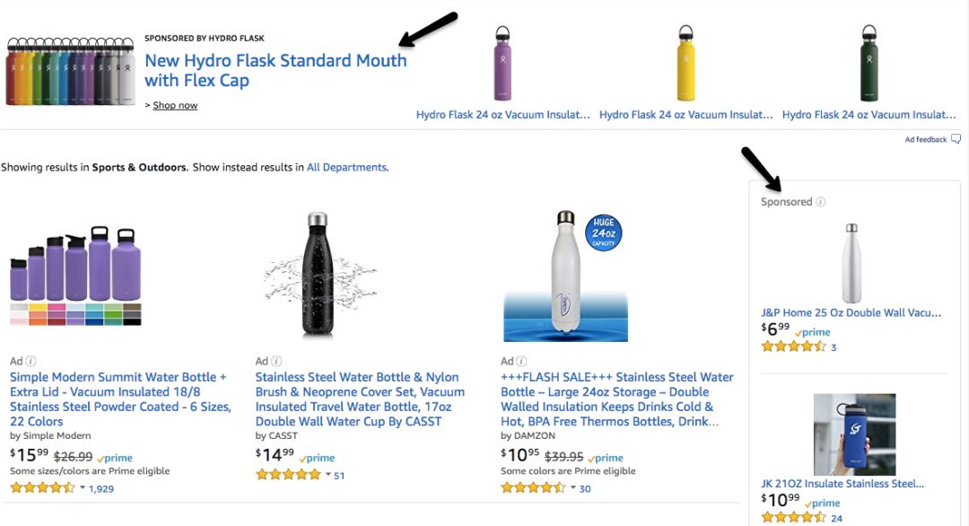 和Google搜索一样,在亚马逊的搜索框输入某个关键词后,排在前列的搜索结果有一部分是赞助商链接——这些链接就属于亚马逊广告的范畴,一般此类内容上会标有“sponsored”或者“ad”的字样。