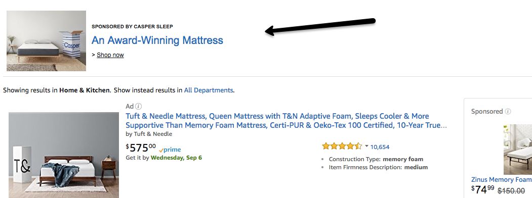 这类广告一般以通栏标题广告的形式出现在搜索结果的最上方,收费方式也是点击付费的形式,能够将用户引导到亚马逊的某一特定页面,而登录页面一般都是根据客户定制的。标题搜索广告也属于关键词定位广告,并且可用于同时推广三个或更多的产品。而这类广告的关键词匹配模式只有两种——精确匹配和词组匹配。