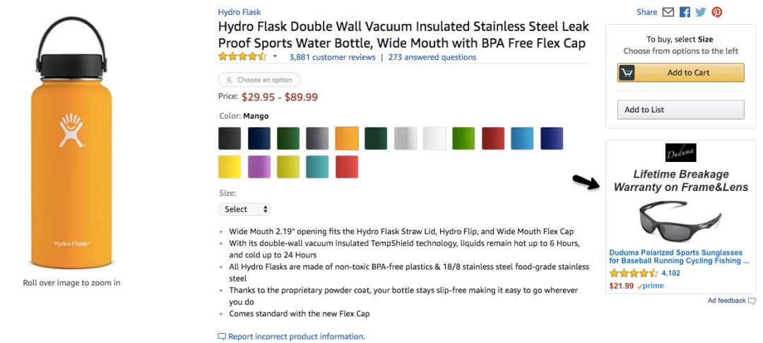 产品展示广告多出现在页面右侧或底部、用户评价页面、产品列表页或亚马逊的电子邮件中。一般能直接将用户引导到产品展示页面,并也采用了点击付费的形式。但与前两种有所不同,这类广告不是关键词定位广告,而是以兴趣和产品特质为基础的广告。广告主可以从产品列表中进行选择(例如选择正在售卖的某个相似的产品),也可以根据用户兴趣进行推荐(直接将产品推送给可能感兴趣的相关用户)。但值得注意的是,每一个营销活动只支持一种定位方式。
