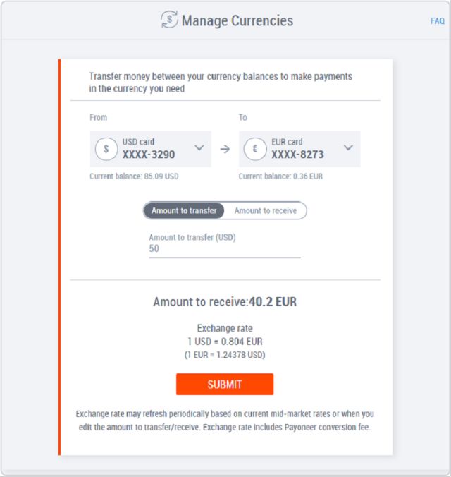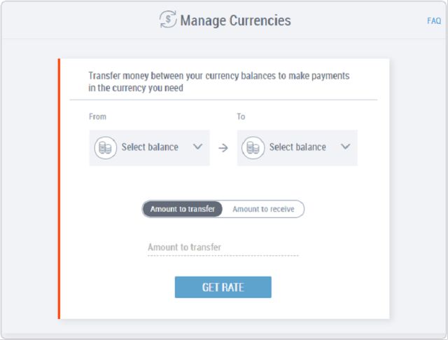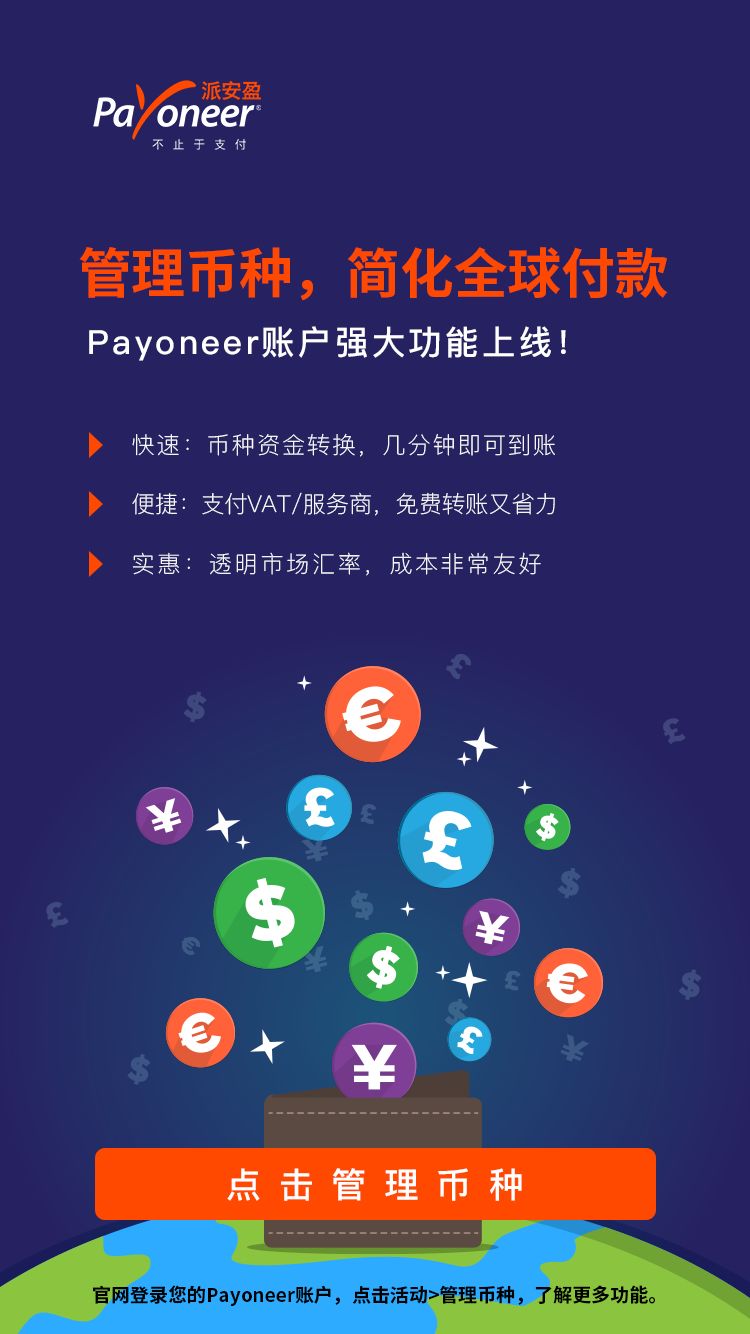 它能够让您有相应金额的币种以进行下列支付: >>> 向供应商和服务商免费转账特定币种的资金 >>> 进行VAT支付 >>> 当服务商使用闭环API从您的账户扣款,保证您将被扣款的币种有足够资金 管理币种的操作也十分简单哦~ ▼ 如何操作 1 登录您的Payoneer账户并点击活动>管理币种,进入该页面。 2 选择--> 您希望兑换的币种 3 选择--> 您希望获得的币种 4 输入金额。 您可以输入想要兑换的或者想要获得的金额 5 点击获得汇率并查看汇率(已包含费用)和金额。所显示的汇率将在短期内失效。 6 点击提交 并完成币种间的资金转换。 只需短短6步! 几分钟即可收到您所需的币种。 另外还有关于 管理币种操作的几条小贴士 助您更快捷方便的理解并操作哦~ ▼ 小贴士 ▶ 请求提交后,一般几分钟之内资金就会转到余额中。* ▶ 特定币种可能会在某些时段无法进行兑换。若出现这种情况,我们会在您提交请求前进行提示。 ▶ 我们目前支持的主要币种有美元、欧元、英镑。随着时间变化,不同地区支持的币种可能也将发生变化。 ▶ 如需使用币种管理功能,您要有至少两个所支持的币种。如果您需要其他币种开放此功能,请联系我们。