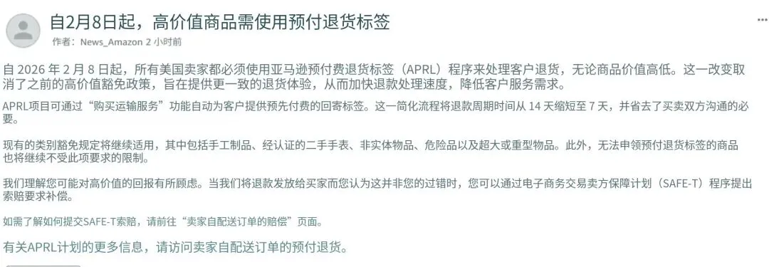 从积极层面看,标准化的APRL流程确实减少了与买家的沟通内耗。尤其是中小卖家,无需再手动处理退货标签制作、寄回地址确认等繁琐事务,运营效率得到一定提升。