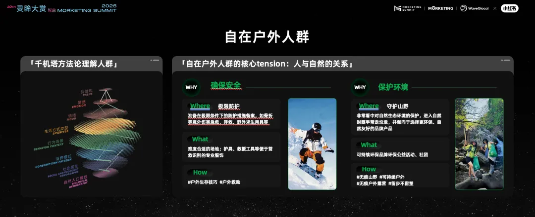 “保护环境”也同样如此。当“守护山野”成为用户背后的价值观,那么在户外出行这一情景中,那些环境友好的品牌自然也会更多被这类人群看见并选择。