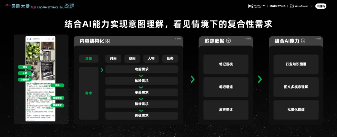 但实际上,这一个个情绪、需求、解决方案是不能独立而看的,其需要被串联起来,并以此进一步形成通向“窄门”的路径。AI的加持,也让小红书进一步迭代了自己的研究思路——通过更细致的分析,帮助品牌更准确地了解消费者的真实需求和心理动机,并串联起情境、需求、情绪与解决方案。