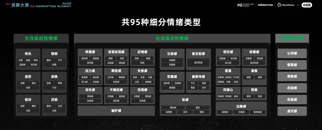 Morketing了解到,今年,小红书联手睿丛共建了「情绪研究方法论」,内涵35个情绪大类与95种具体情绪,并借助AI之力,试图在每篇笔记中推理、识别用户所表达的真正情绪。