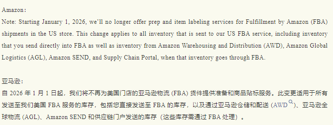 近日,亚马逊官方正式宣布,自2026年1月1日起,美国站点将全面停止提供FBA的备货准备及商品标签服务。