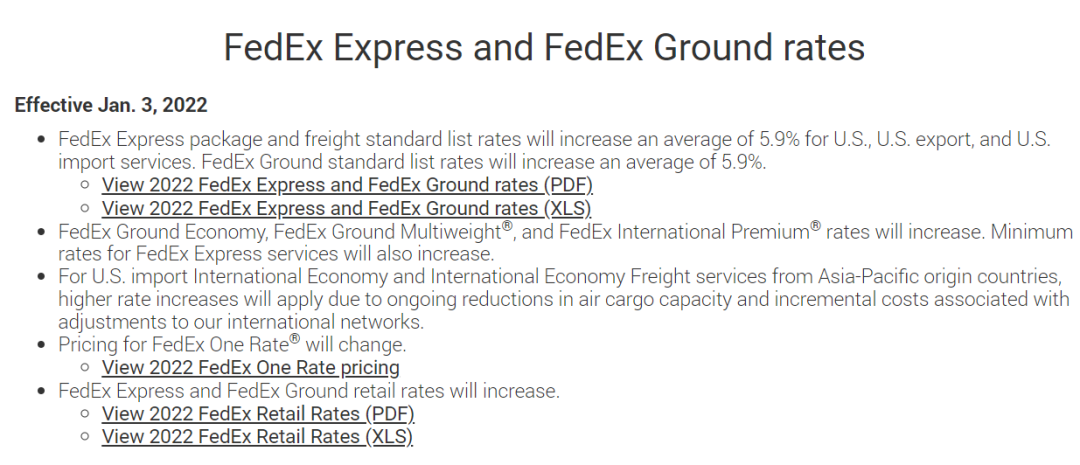 FedEx 官方发布声明称:于2022年1月3号正式实施新价格,各线路费用涨幅约在5.9%左右,同时附加费用模块进行了分区管理。