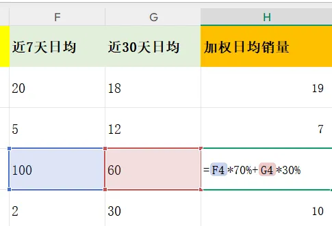公式:加权现有销量 = (近7天日均 × 70%) + (近30天日均 × 30%)
