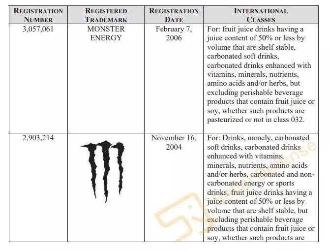 本案也于7月4号开始冻结。该品牌LOGO酷似一个鬼爪,也是注册商标。注册大类主要为032啤酒饮料类,以及025服装鞋帽类、018皮革皮具类、016办公用品类等,涵盖范围很广。只要是标题里含有Monster Energy或者产品用了鬼爪LOGO的,都算侵权: