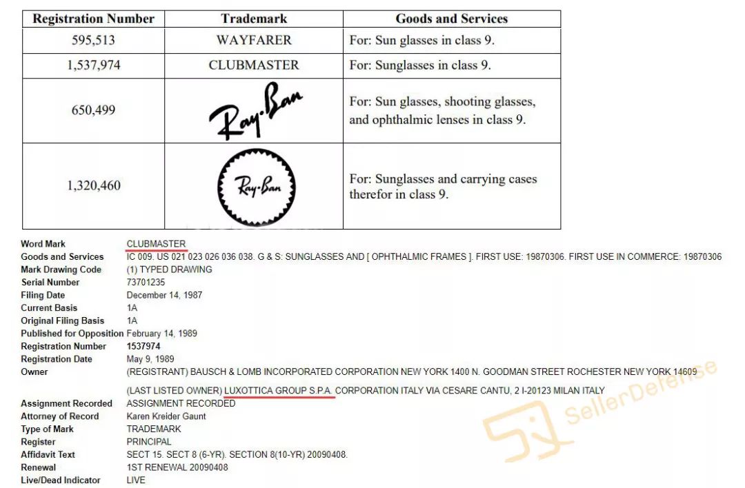 本案刚刚冻结,雷朋也是我们的老朋友了,每年GBC都要为该品牌发好几个案件。主要涉及的产品是眼镜类,Rayban 还有2个小品牌 WAYFARER 和 CLUBMASTER,这两个关键词都不能碰: