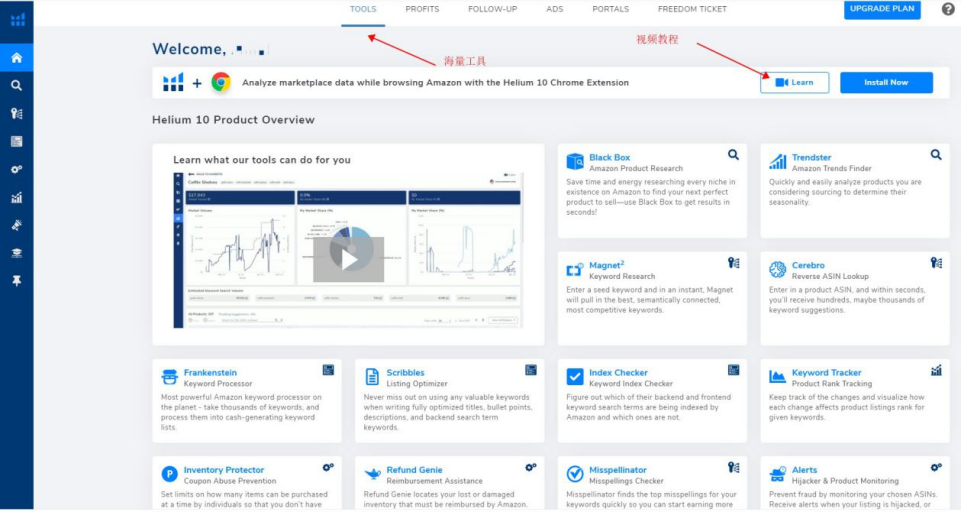 Cerebro——关键词反查:把ASIN放进去,就能搜到竞争对手使用的关键词Magnet——关键词搜索Index Checker——检测已被亚马逊收录的关键词Keyword Tracker——准确检测关键词在亚马逊的排名情况Misspellinator——客户搜索词修正,让客户即使输入错误的关键词,也能搜到对应的产品 大家不要被Helium 10控制面板这么多工具给吓到了,它的每一个工具都有视频教程的,跟着视频一步步操作就好。