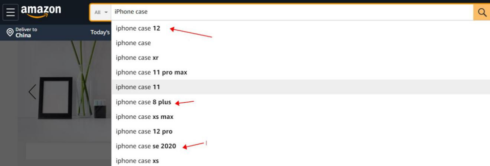 比如,我在首页输入了iPhone case这个词,下面就出现了好几个相关的关键词,这是亚马逊后台根据最近的热门搜索来生成这个提示列表的,所以很有可能你这周和下周搜索到的提示关键词是不一样的。