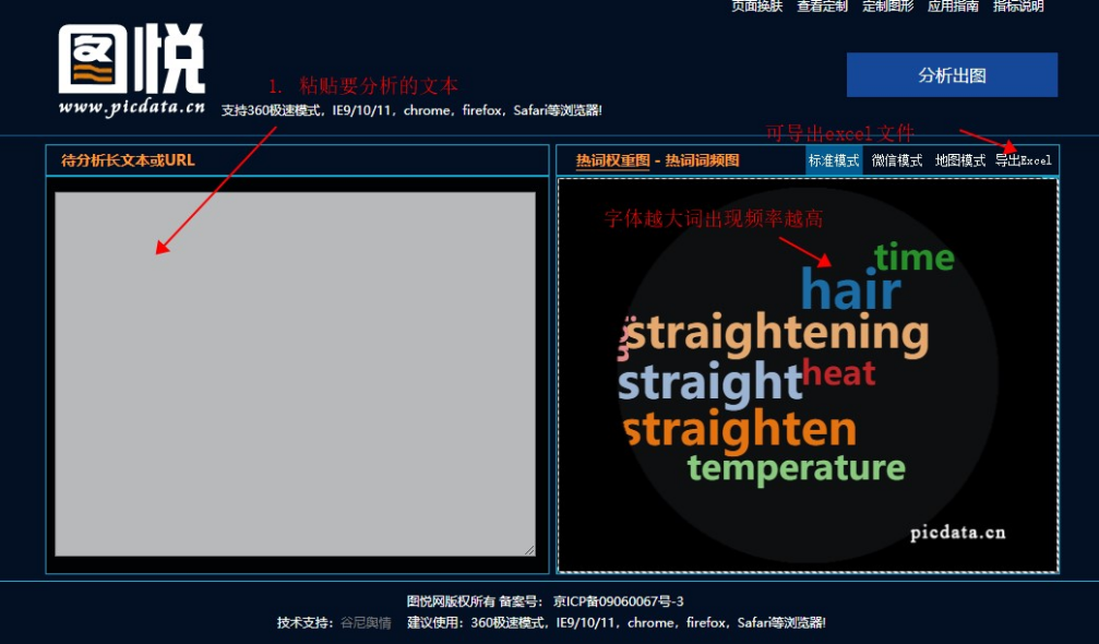 操作步骤:粘贴要分析的文本→单击“分析出图”→ 可选择导出excel进行深入编辑