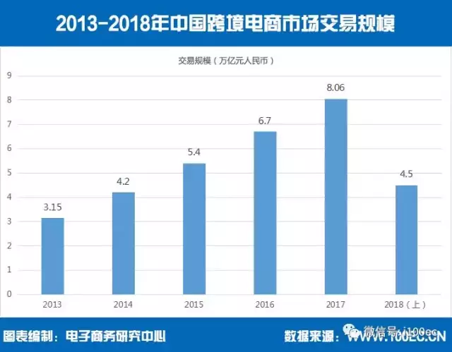 据电子商务研究中心(100EC.CN)监测数据显示,2018上半年中国跨境电商交易规模为4.5万亿元,同比增长25%。