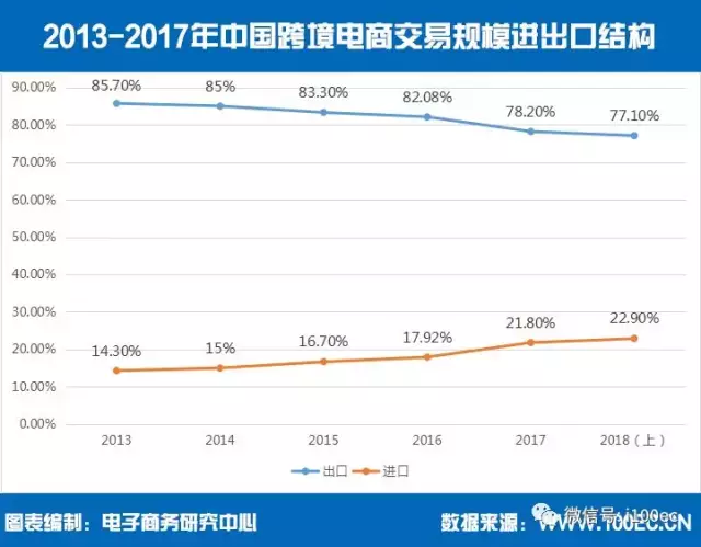 据电子商务研究中心监测数据显示,2018上半年中国跨境电商的进出口结构上出口占比达到77.1%,进口比例22.9%。