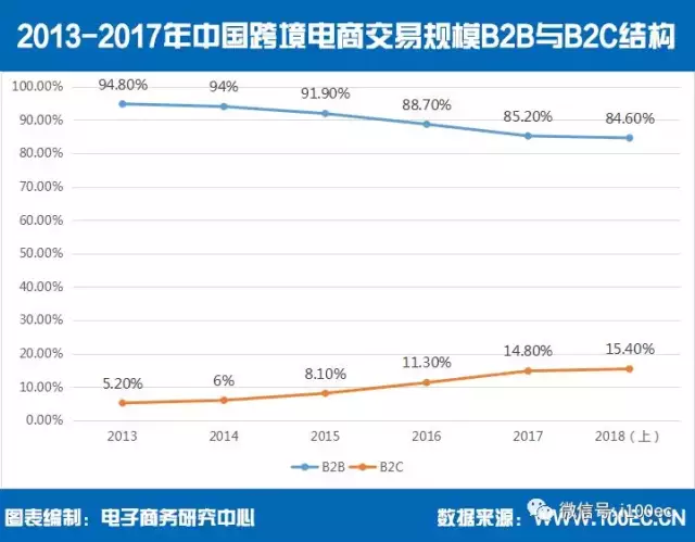 据电子商务研究中心监测数据显示,2018上半年中国跨境电商的交易模式跨境电商B2B交易占比达84.6%,跨境电商B2C交易占比15.4%。
