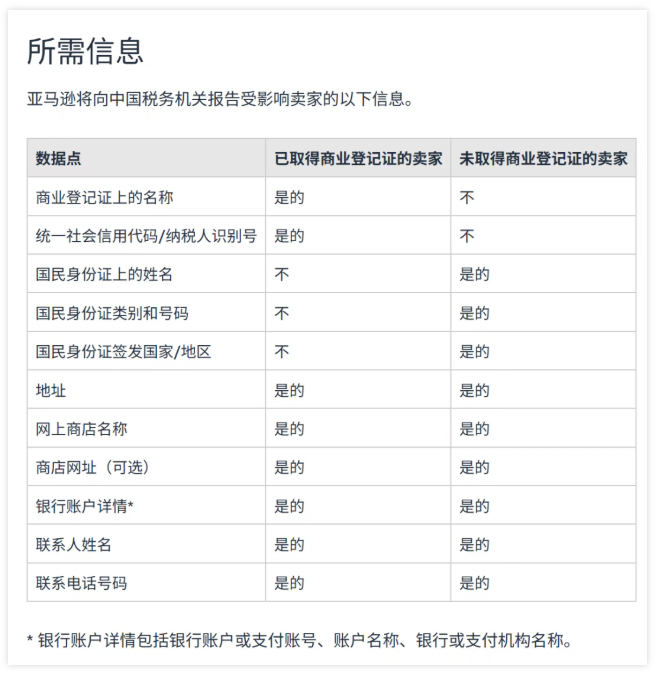 此外,不管是企业还是个人卖家,地址、店铺名称、店铺网址、银行账户详情、联系人姓名和电话这些基础信息,包括交易数量、销售收入以及支付给平台的佣金和服务费等经营数据也包含在内。
