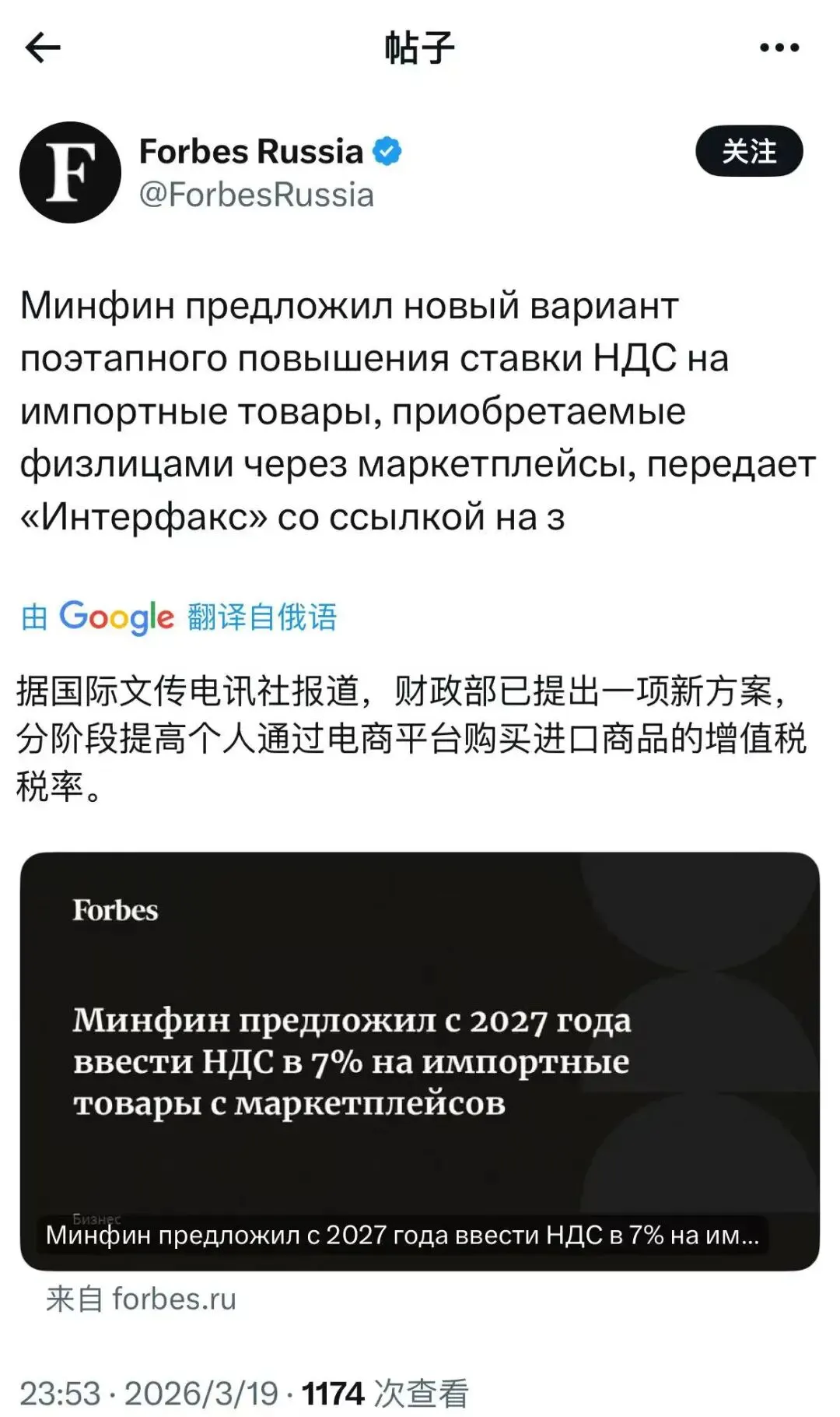 福布斯Forbes Russia透露,俄罗斯财政部已完成跨境电商进口商品增值税的新政草案拟定,计划于2027年至2029年分三个阶段逐步调整,最终将税率统一上调至22%。